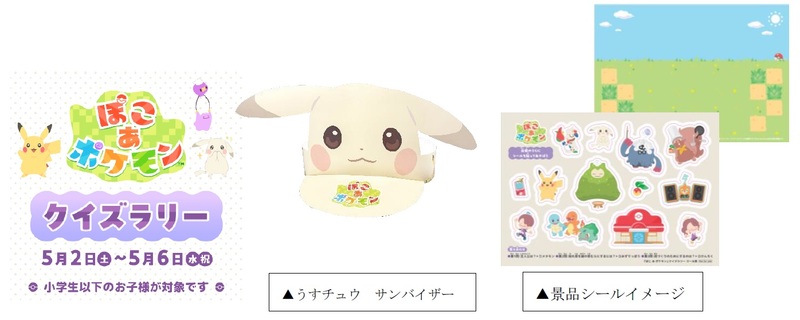 ・内 容:発売中の大人気ゲームソフト『ぽこ あ ポケモン』をテーマとしたクイズラリーを全国61のモールで開催。参加者はゲーム内に登場する、 うすチュウのサンバイザーを被り、クイズに答えながら館内のスポットかんばん を回ることで、オリジナルのシールをゲットできます。