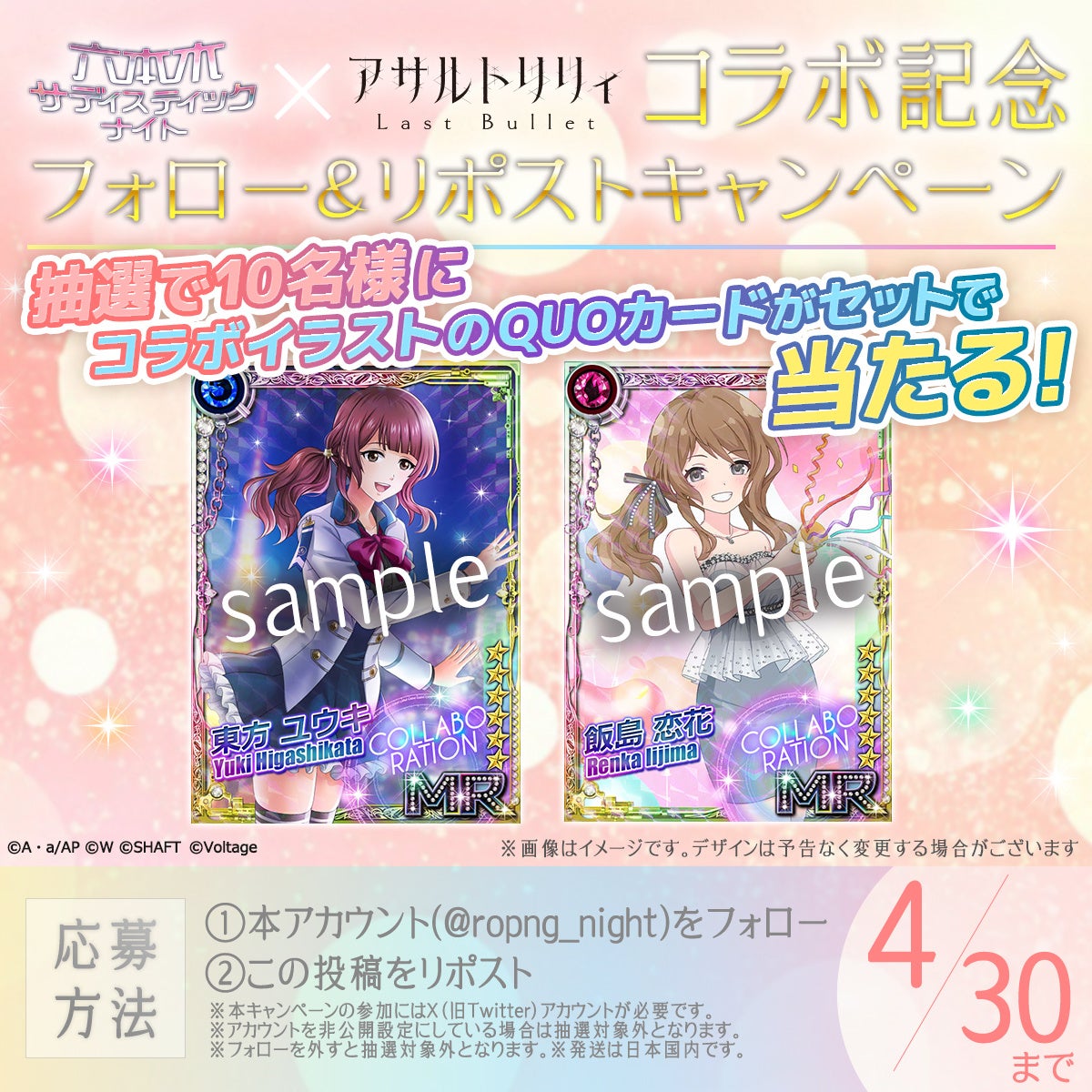 本企画では、「アサルトリリィ Last Bullet」とのコラボガチャを開催いたします。コラボ衣装を身にまとった「アサルトリリィ Last Bullet」の「飯島恋花」と、「六本木サディスティックナイト」の「東方ユウキ」が、描きおろしの限定カードとして登場いたします。さらに、本コラボカードには、人気声優・石飛恵里花の録りおろしボイスを収録しております。ここでしか手に入らない特別なカードを、ぜひお楽しみください。