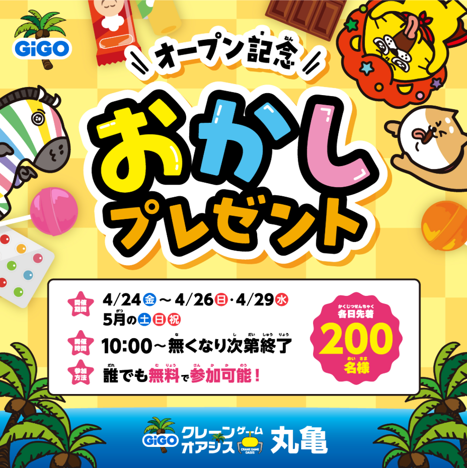 「GiGOクレーンゲームオアシス丸亀」のオープンを記念して、各日10:00から「先着200名様」限定で「おかしプレゼント」のイベントを開催いたします。無料でご参加いただけます。