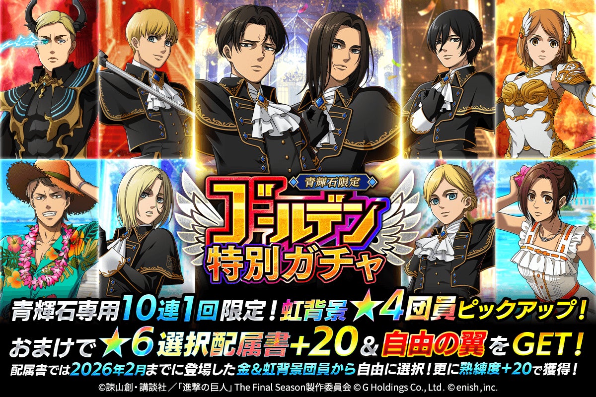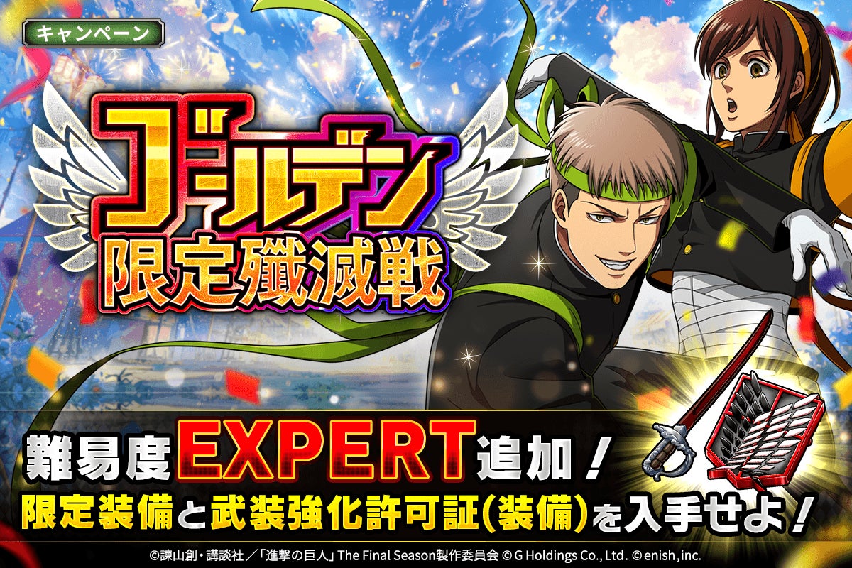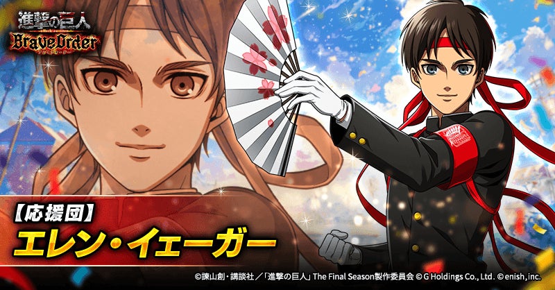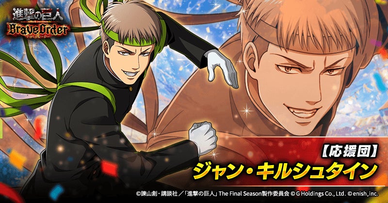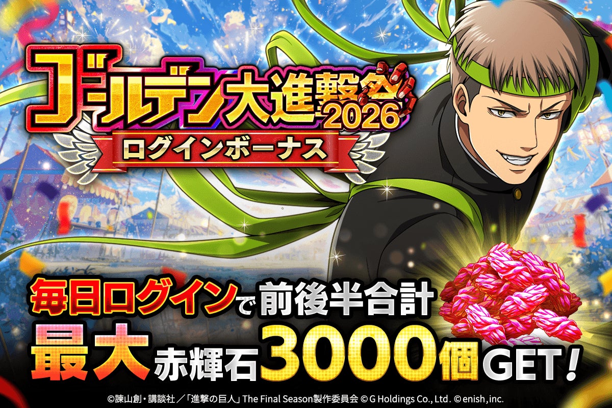 株式会社enish(本社:東京都港区、代表取締役社長:安徳 孝平、以下enish)は、アニメ『進撃の巨人』のスマートフォンゲーム最新作「進撃の巨人Brave Order」にて、2026年4月24日(金)より、ゴールデン大進撃祭2026を開催!今ならガチャなどに使用できる赤輝石が最大3,000個もらえちゃう!またゴールデン大進撃祭2026前半ミッションではジャンの特別な衣装、進撃の応援団イベントでは育成素材の熟練技能書が最大300個GET可能!その他、最新情報はゲーム公式サイト・ゲーム公式X(旧Twitter)アカウントにて随時公開して行きますので、ぜひご覧ください。