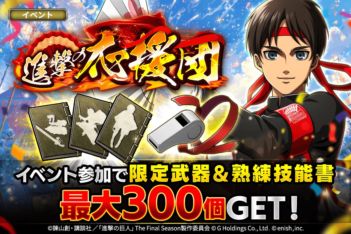 2026年4月24日(金)より、進撃の応援団を開催!イベントに参加して最大300個の熟練技能書を手に入れちゃおう!