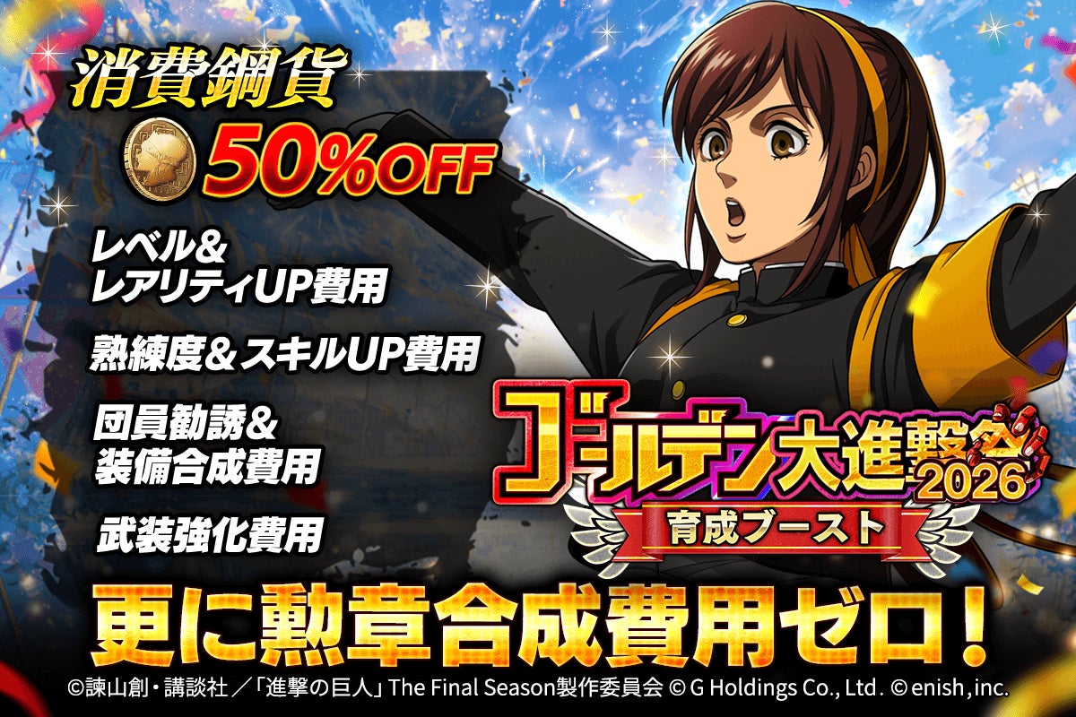 2026年4月24日(金)より、団員のLvアップやレアリティーアップなどの育成費用が半額になるゴールデン大進撃祭2026ブーストを開催!この機会に団員を強化し強敵に挑もう!