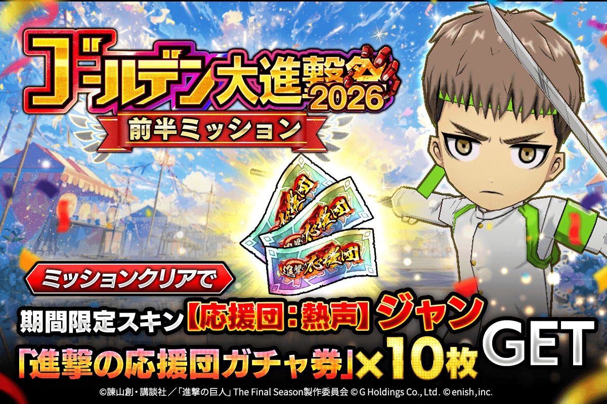 2026年4月24日(金)より、ミッション達成でジャンの限定衣装やガチャ券がもらえちゃう!ゴールデン大進撃祭2026前半ミッションを開催!