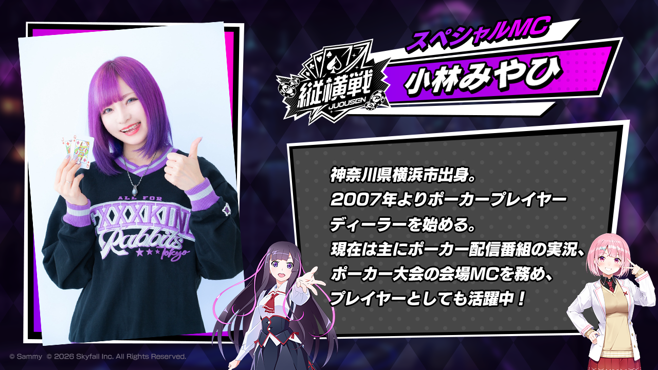 ポーカープレイヤーとしての実績に加え、数々のイベントでMCを務めてきた小林みやひさんが、スペシャルMCとして登場いたします。プレイヤー視点を交えたトークで、ゲーム展開を一層引き立てます。