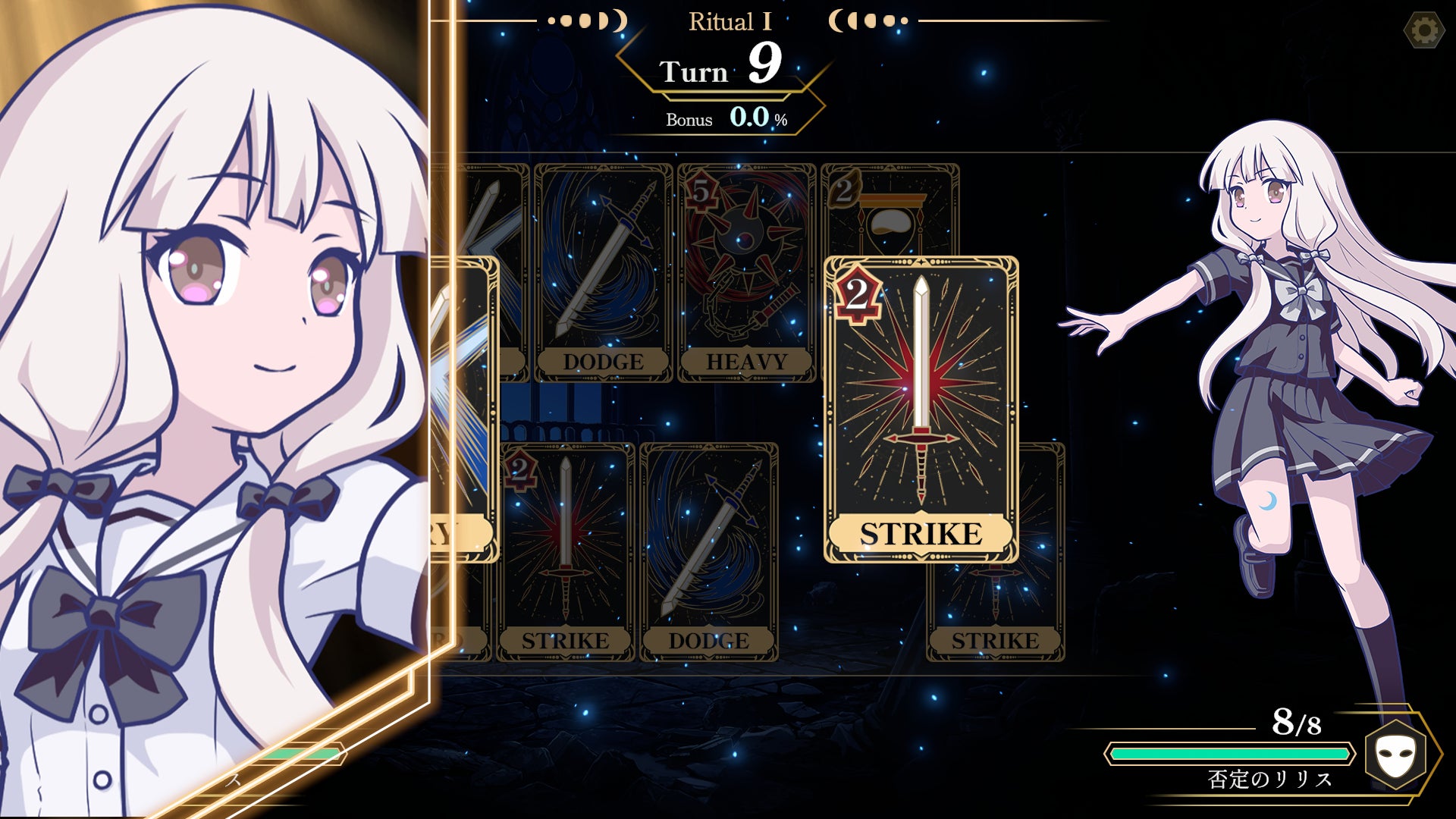 “死にゲー”の戦闘における読み合いの面白さを、ターン制のカードバトルとして再構築。この戦いでは、一撃のダメージがそのまま敗北につながる。パリィ、ガード、回避などお馴染みの行動を駆使して、相手を打ち破った先に待つものは、救いか、それとも―。