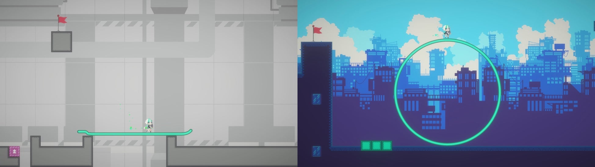 操作は「移動」「ジャンプ」「軌跡の実体化」のみ。空中を飛んだ跡を橋にしたり、円を描いて足場にしたりできます。思い描く理想の軌跡を実体化し、「押す」「引く」「回転させる」等の動作でパズルを解き、ステージを進めていきましょう。