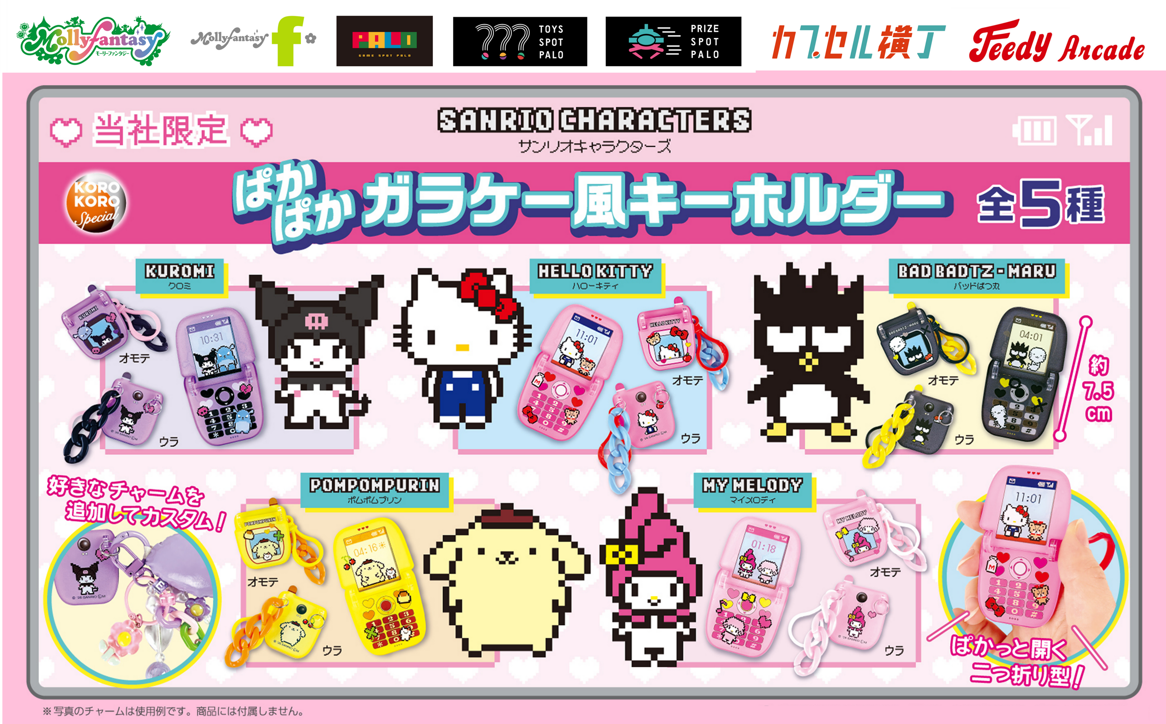 株式会社イオンファンタジー(本社:千葉県千葉市、代表取締役社長:藤原徳也、以下、当社)は、株式会社サンリオのキャラクターたちのカプセルトイ用商品「サンリオキャラクターズ ぱかぱかガラケー風キーホルダー」を、アミューズメント施設「モーリーファンタジー」「PALO」、カプセルトイ専門店「TOYS SPOT PALO」「カプセル横丁」などに設置する当社オリジナル完全キャッシュレスカプセルトイマシン「かぷえぼ」で4月30日(木)より順次展開いたします。