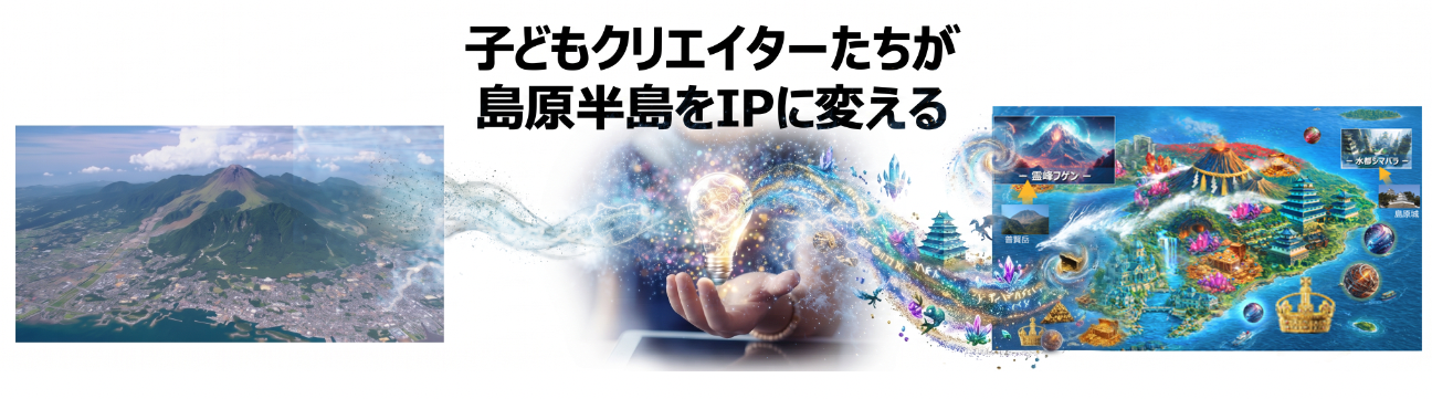 現地で得た学びや発見は、JP UNIVERSEが開発するRPG型プラットフォーム「竜宮国」に、クエストや物語として蓄積されていきます。冒険 → 発見 → 蓄積 → 次の冒険。この循環により、学びを一度きりで終わらせず、次の探究や交流へとつなげていきます。子どもたちの創造力が地域資源をIPへと変え、竜と大地の壮大なクロニクルが、島原半島から紡がれていきます。