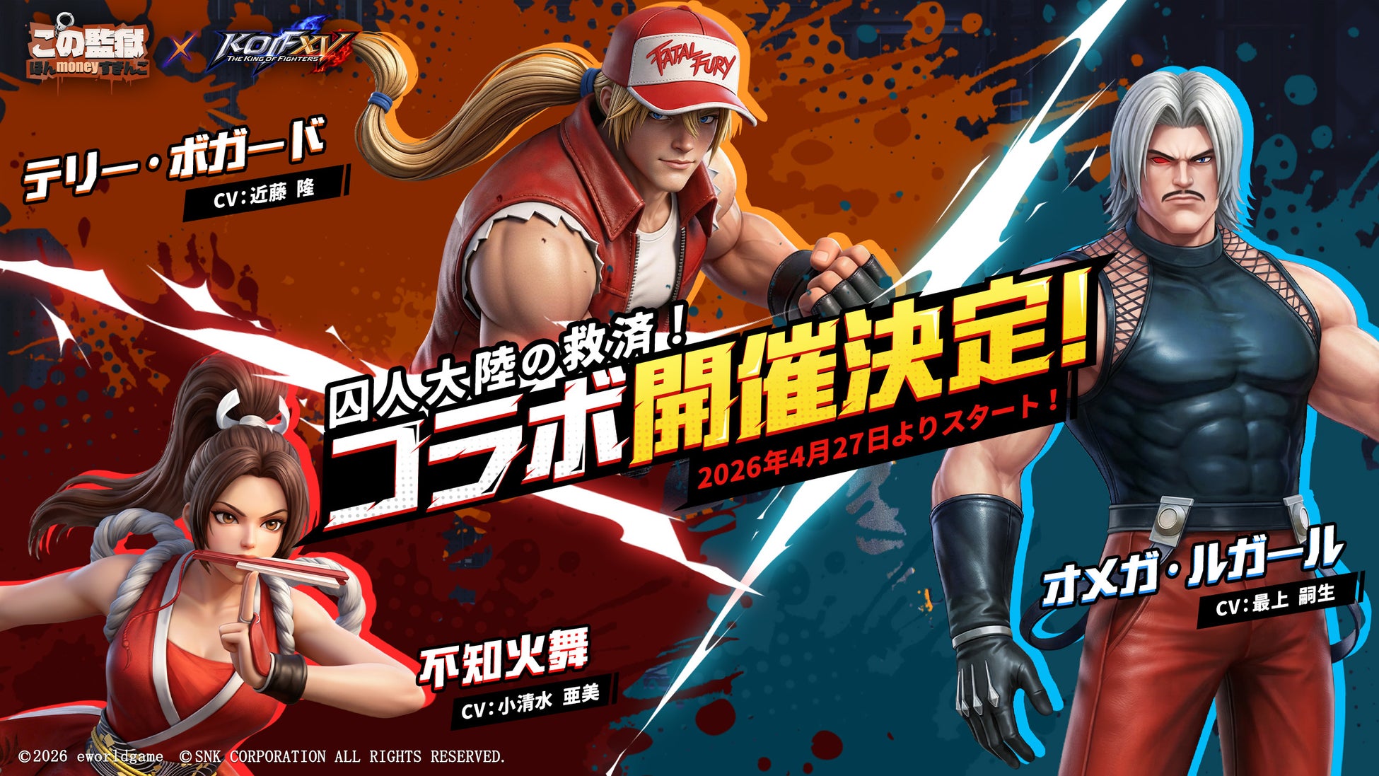 Eworld Gameが配信する経営シミュレーションとストラテジー要素を兼ね備えた、人気スマホゲーム『この監獄ほんmoneyすぎんご』にて、『THE KING OF FIGHTERS XV』(KOF XV)とのコラボイベントが4月27日(月)より正式に開催されます。人気キャラクター「不知火舞」「テリー・ボガード」「オメガ・ルガール」が期間限定で登場し、プレイヤーである「監獄長」たちに新たなストーリーやゲーム体験が提供されます。