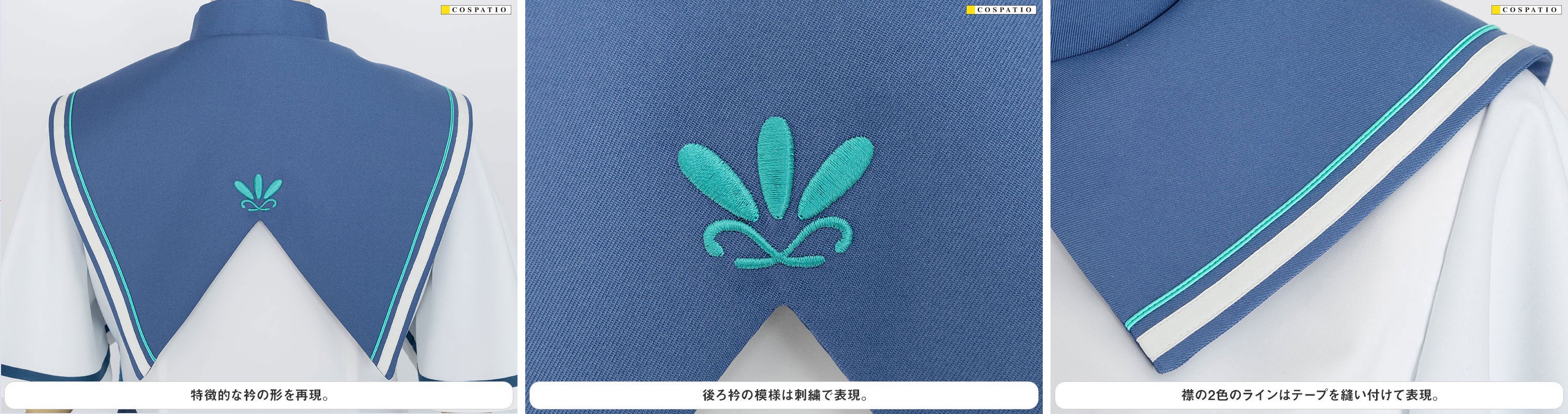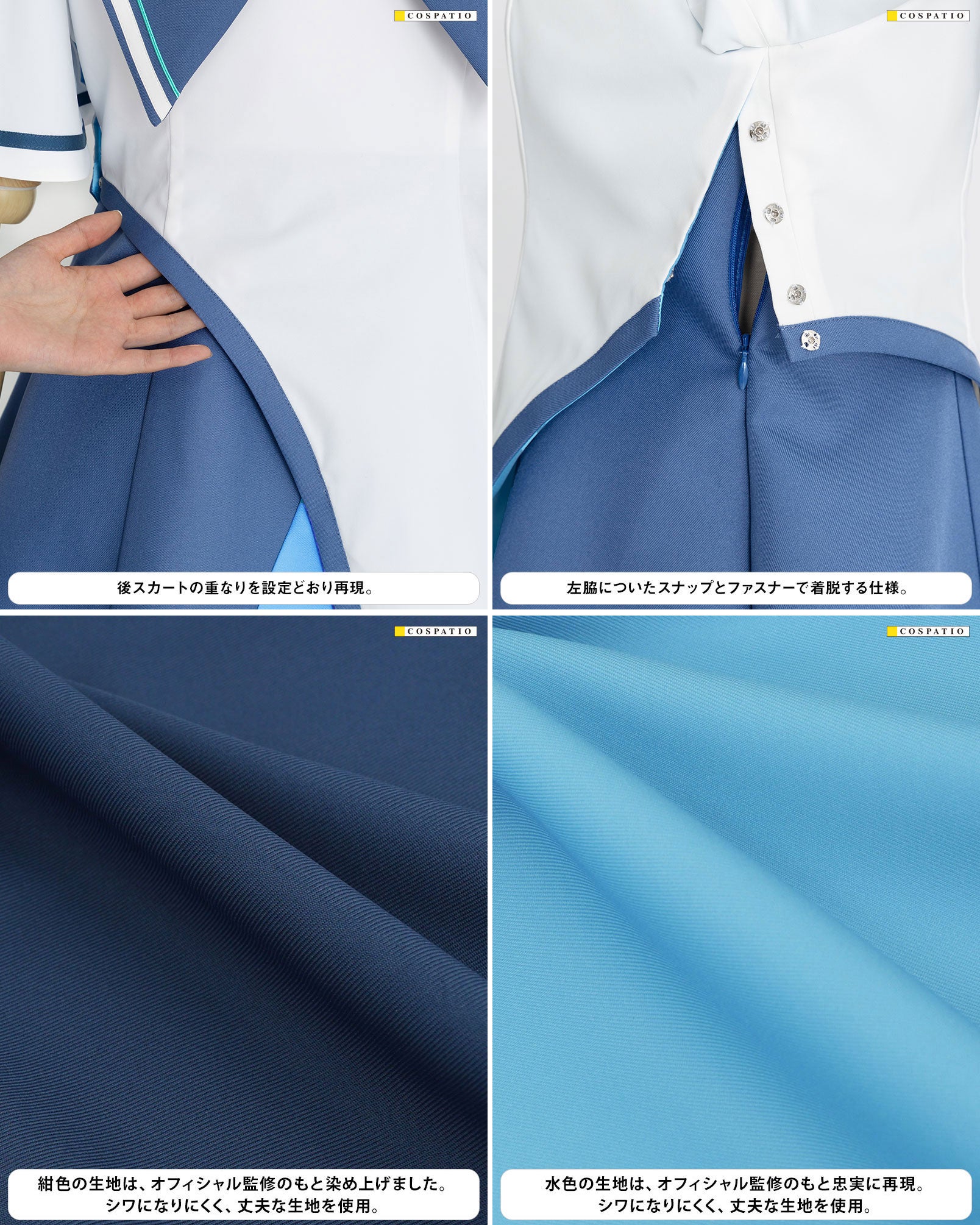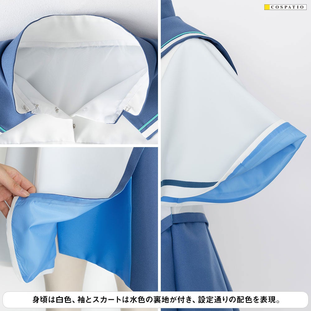 公式設定をもとに女子制服のシルエットや構造を再現することはもちろん、印象的な紺色の生地を染め上げるなどオフィシャル監修のもと忠実に再現。女子制服 ループタイについても、金属パーツをオリジナルで作り起こすことでしっかりと存在があり、金メッキ加工を施すことで高級感ある仕上がりになりました。コスプレ以外にも普段着に合わせてもご使用いただけます。