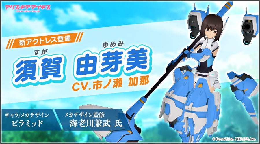 株式会社コロプラ(代表取締役社長 上席執行役員 CEO:宮本貴志、本社:東京都港区、以下「コロプラ」)は、スマートフォン向けゲーム、武装カスタマイズアクション『アリス・ギア・アイギス(以下、アリスギア)』にて、4月27日(月)より免許とりたて新米アクトレス「須賀 由芽美(CV:市ノ瀬 加那)」がプレイアブルキャラクターとして登場したことをお知らせします。