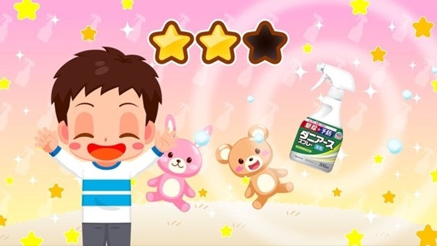 『ダニアーススプレー』は、スプレーするだけで手軽にダニを駆除できる虫ケア用品です。本ゲームでは、家の中に潜むダニをターゲットに、画面をひっぱって離すアクションでボール状に変化した『ダニアーススプレー』を噴霧して退治します。布団やソファなどダニが気になる場所を狙い撃つ爽快な体験を通じて、目に見えないダニの存在と、正しいケアの必要性を学びます。