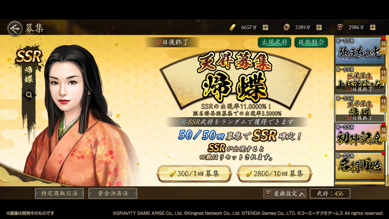 この機会にぜひ「帰蝶」をはじめとするSSR武将を配下に加え、戦局を有利に進めましょう!