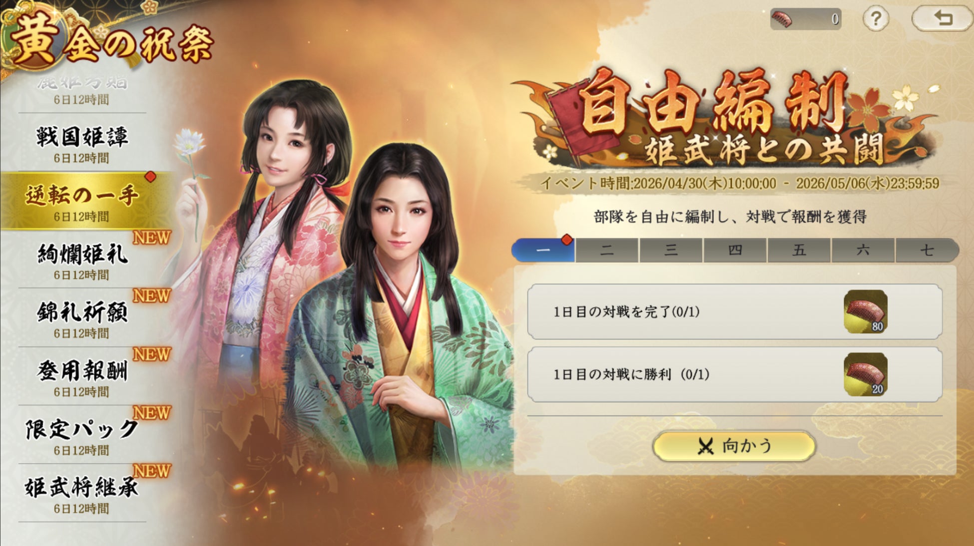 毎日新たなステージが開放され、指定の武将で部隊を編制し敵部隊を撃破することで報酬を獲得できます。姫武将「お初」「お江」も編制に含まれており、参加するだけでも報酬が獲得できます。さらにクリアで追加の豪華報酬も獲得できます。