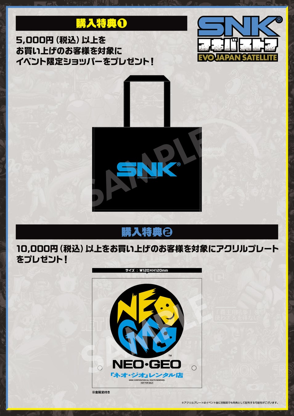 SNKブース内に設置された物販スペース「SNK アキバストア EVO JAPAN SATELLITE」において公式グッズの販売をおこないます。本イベントのために用意されたグッズのほか、「SNK アキバストア」で人気の商品、掘り出し商品のゲームソフトなどを取り揃えてお待ちしております。