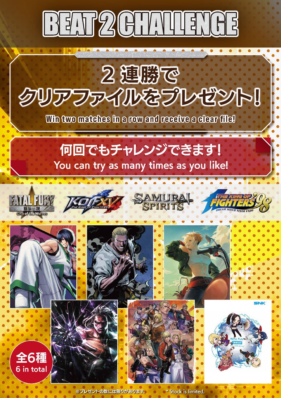 『餓狼伝説CotW』、『KOF XV』、『SAMURAI SPIRITS』、『KOF ’98』の対戦台を設置。さらに『KOF ’98』は、1フレーム未満の入力処理による業界最速クラスのレスポンスを実現した『exA-Arcadia』基板と筐体を使用!2連勝した参加者には、『餓狼伝説CotW』クリアファイル(全6種)を1枚プレゼント。何回もチャレンジしてコンプリートを目指そう!