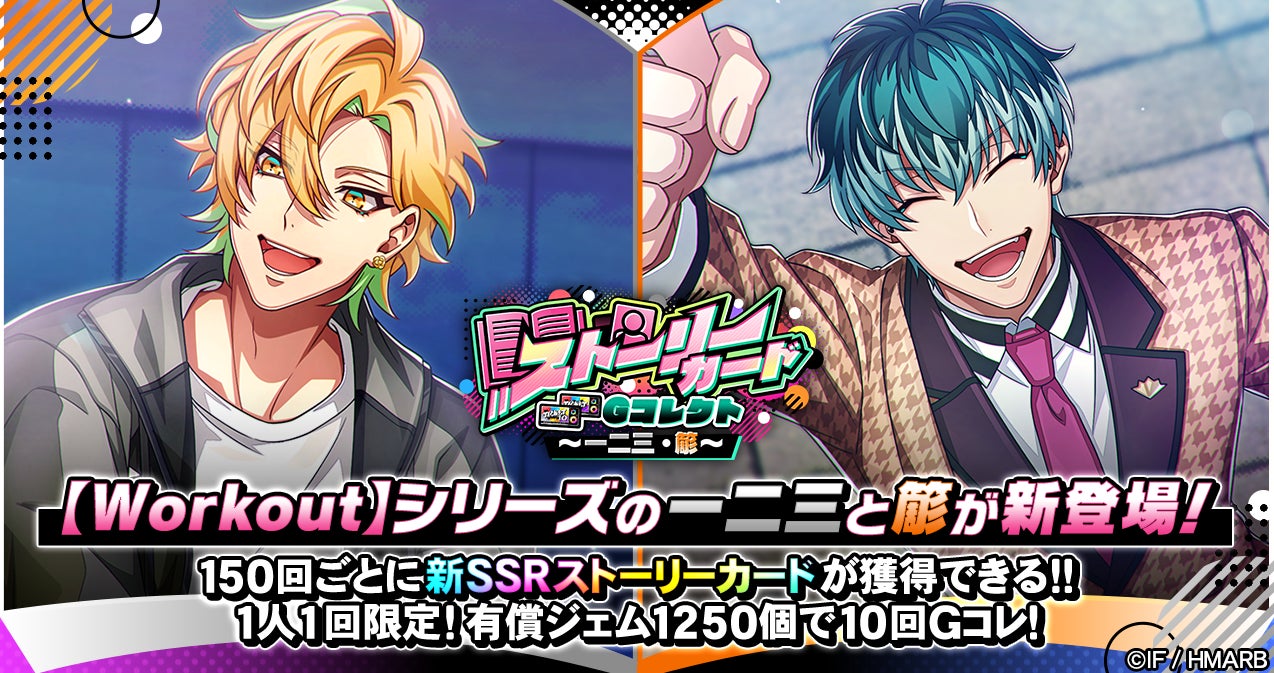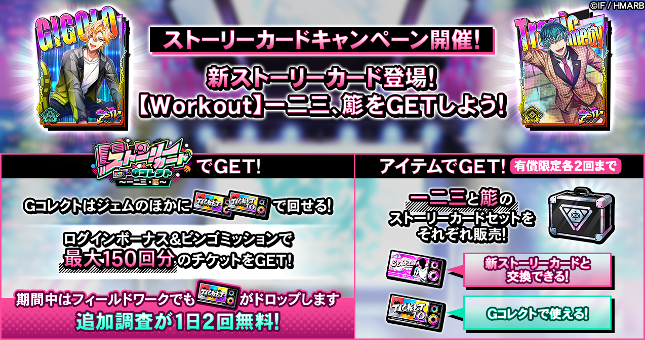 新ストーリーカード「SSR【Workout】伊弉冉一二三」と「SSR【Workout】白膠木簓」を獲得することができるGコレクトを開催しています。Gコレクトはジェムのほか、専用チケット「ストーリーGコレチケット(vol.6)」各種を使うことでも回すことができ、ビンゴミッションとログインボーナスで最大150回分のチケットを獲得できます。
