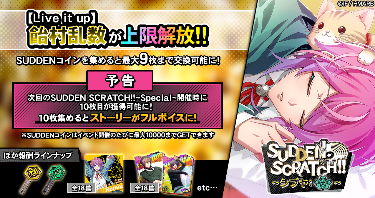 イベント期間中、KILLER SCRATCH!!をプレイするとライズ消費量に応じた確率でSUDDEN SCRATCH!!が発生します。SUDDEN SCRATCH!!をプレイすると、通常の報酬アイテムの他、限定アイテム「SUDDENコイン」を獲得することができます。「SUDDENコイン」を集めることで、「A.R.B remix」楽曲やレイズキー、シブヤ・ディビジョンのデコステッカーに使えるブースターなどと交換することが可能です。また、ストーリーカード「SSR【Live it up】飴村乱数」が上限解放され、最大9枚まで獲得できます。詳細はアプリ内お知らせをご確認ください。さらに、SUDDEN SCRATCH!!~Special~の開催時には10枚目が獲得可能となり、10枚集めるとカードストーリーがフルボイスに!