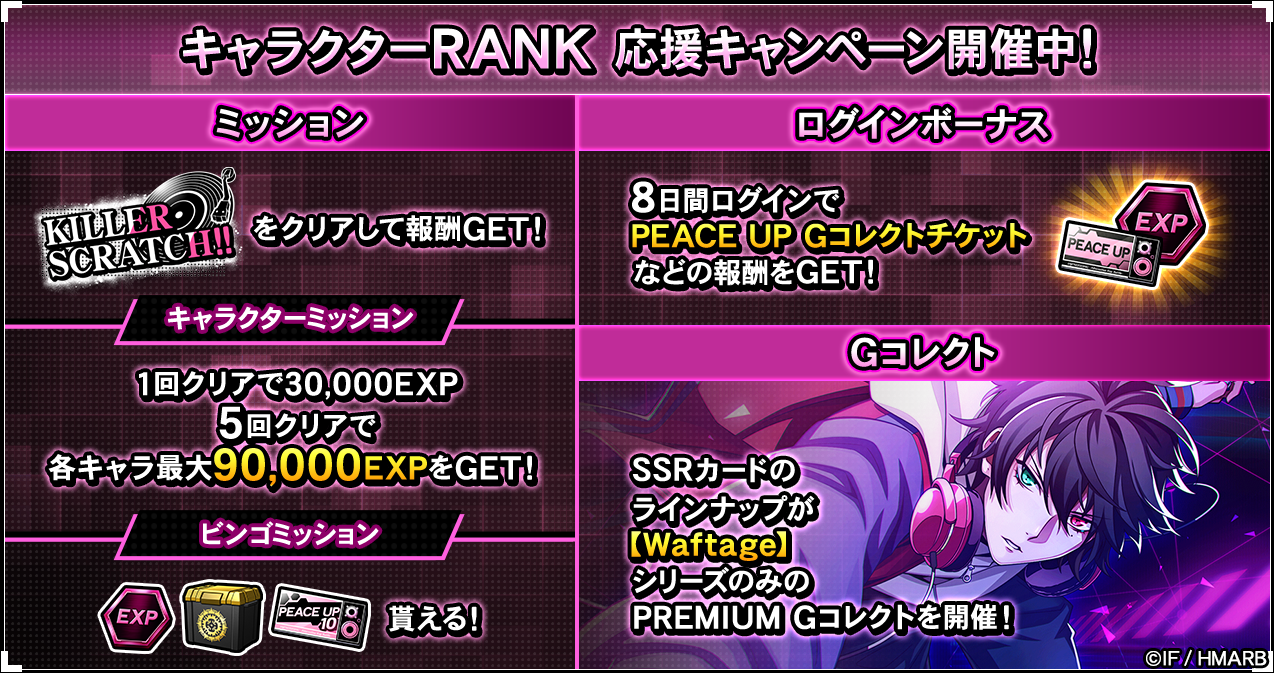 期間中、キャラクターRANK EXPを各キャラクター最大90,000獲得できるキャラクターミッションをはじめ、ビンゴミッションやログインボーナスを開催しています。期間中、8日間ログインで「PEACE UP Gコレクトチケット」などの報酬を入手できます。