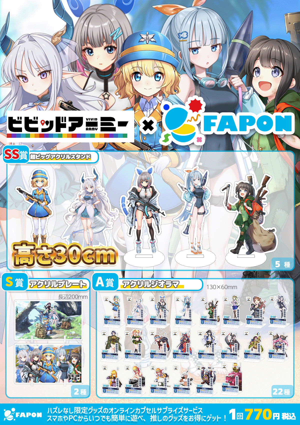 VTuber事務所として初となる自社オンラインくじ『FAPON』は、CTWが運営するG123のオンラインゲーム『ビビッドアーミー』との7周年記念コラボ企画を展開いたします。