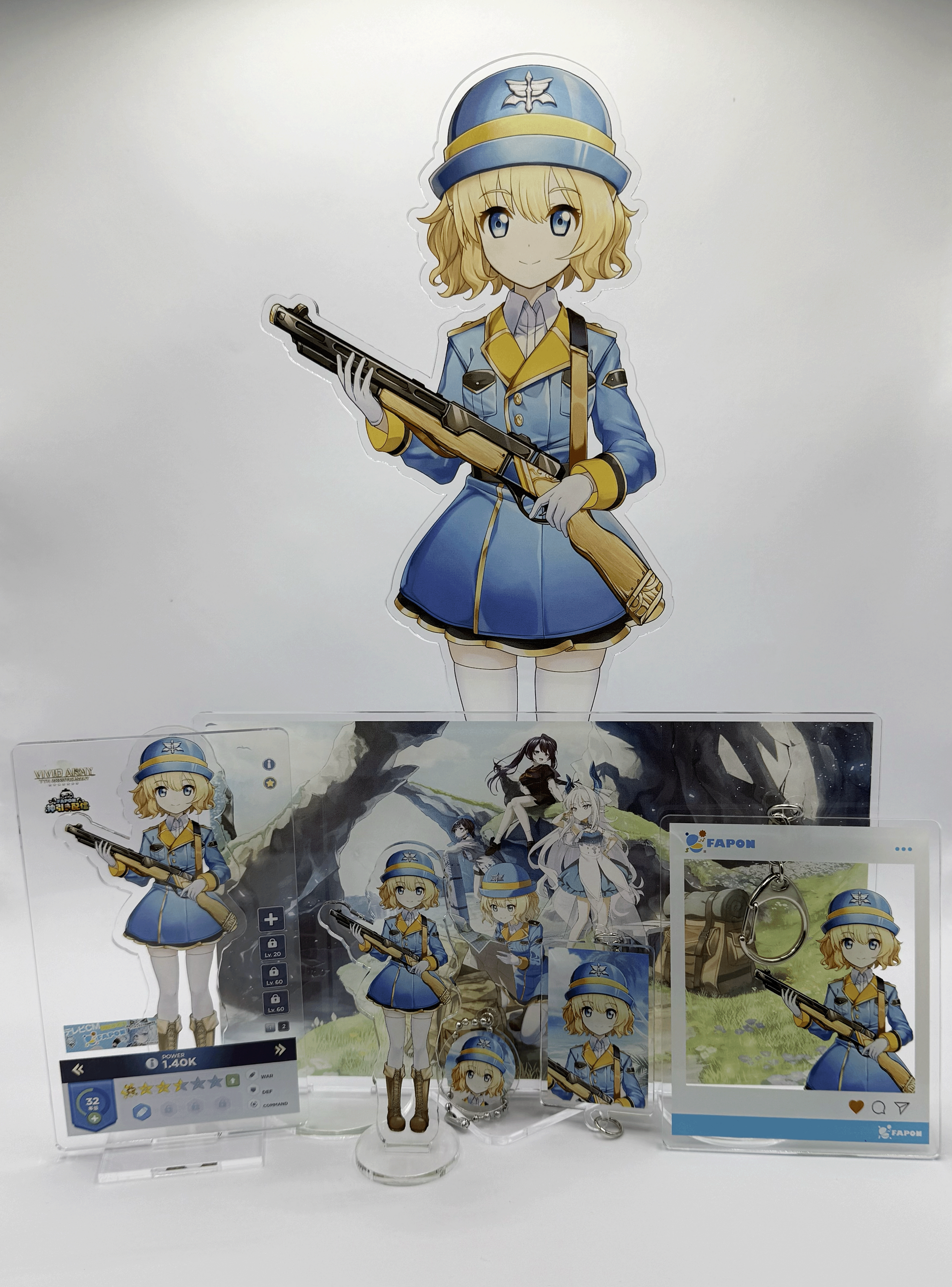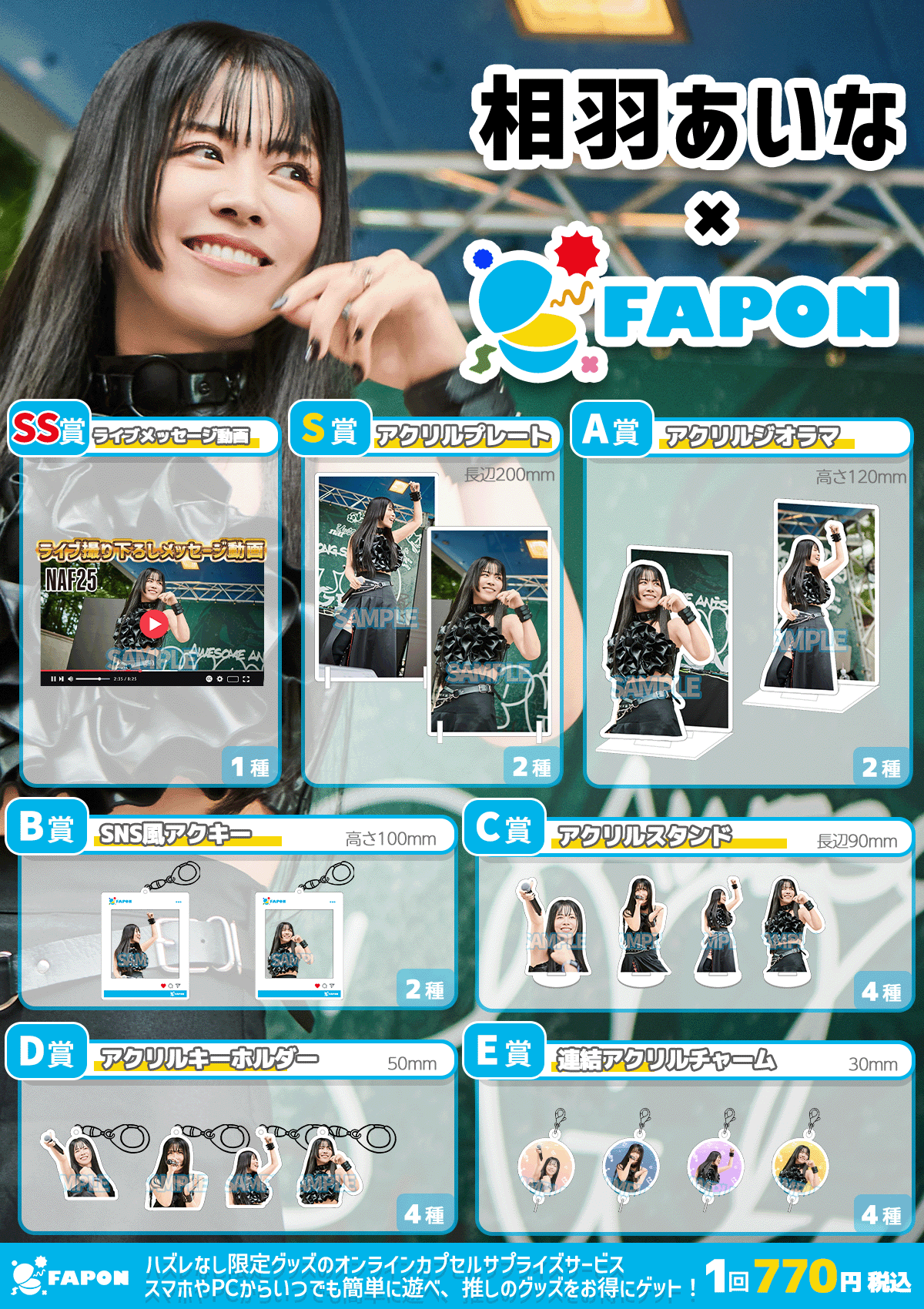 FAPONは自社グッズ工場の体制を活かし、業界でも珍しくレアリティが低い賞を含む全ての賞でアクリルグッズでの展開をしております。