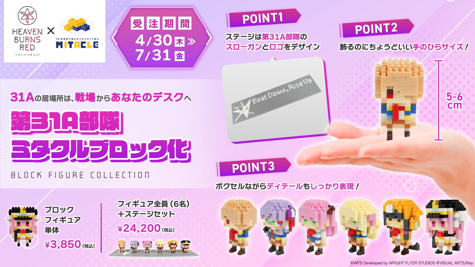 株式会社G-ant(所在地:東京都中央区、代表取締役:平川 彰悟)は、ライトフライヤースタジオ × Keyが贈るドラマチックRPG『ヘブンバーンズレッド』とのコラボレーションとして、ボクセル技術を活用した組み立てフィギュア「ミタクルブロック」の新商品6種+コンプリートセットを発売いたします。主人公・茅森月歌が所属する第31A部隊6名が、それぞれミタクルブロック化。
