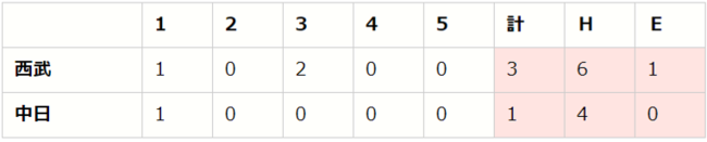 1番・源田で2本の長打を放ち、クリーンナップで本塁に還す得点パターンへと繋げ勝利した西武・毛利はプロリーグ初勝利。中日・新井は同点に追いついた直後の1死1、3塁で併殺に倒れ、リードする展開が作れなかった。