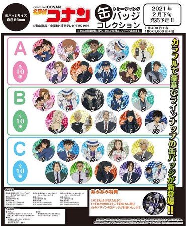 大網株式会社(本社・東京都文京区)が運営するホビー通販大手「あみあみ」では、 『名探偵コナン トレーディング缶バッジコレクション(ゼロジーアクト)』の「A 10個入りBOX」、「B 10個入りBOX」、「C 10個入りBOX」をそれぞれ、現在予約受付中です。