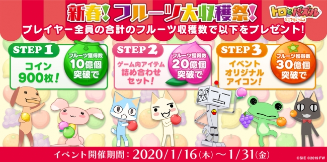 株式会社フォワードワークス(以下FW)は、スマートフォン向けパズルゲーム『トロとパズル~どこでもいっしょ~』(以下、『トロとパズル』)において、プレイヤー全員の合計のパズルのフルーツ収穫数に応じてゲーム内アイテムやプロフィールアイコンなどがもらえる「新春!フルーツ大収穫祭!」を本日1月16日(木)から開始することをお知らせいたします。